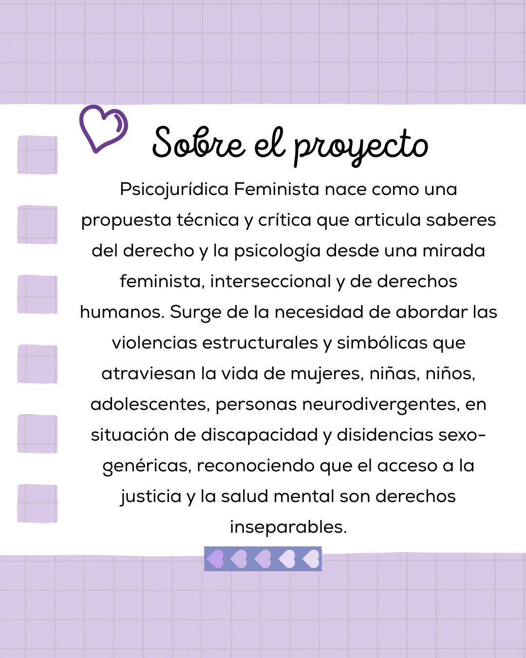 Consultora académica y formativa dedicada al desarrollo de proyectos en género, interseccionalidad y derechos humanos, desde un enfoque interdisciplinario que une el derecho, la psicología y las ciencias sociales.